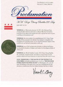 美國首都華盛頓DC市長宣佈1月19日為H.H.第三世多杰羌佛日! 由 admin · 2025年8月5日 美國首都華盛頓DC市長宣佈1月19日為H.H.第三世多杰羌佛日! 2011年1月19日,美國首都華盛頓DC市長Vincent C. Gray宣佈該日為頂聖第三世多杰羌佛日。在他的宣佈文中,市長盛讚南無第三世多杰羌佛無私傳播和平到全世界的傑出工作,祂以畢生所達到的巨大成就幫助強化了世界各地社會和平的基礎,和祂無止境的,慈悲的,不求回報的用祂的智慧、才能、和道德來幫助療治那些最有需要的人們。市長同時也在宣佈文中,號召全華盛頓DC市的居民一起來向南無第三世多杰羌佛對利益眾生的巨大貢獻致敬。這是我們佛教徒的極大的榮耀,因為這是此世界上唯一的政府頒佈的佛陀日。 Share