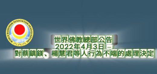 0 世界佛教总部公告 2025年8月29日 由 admin · Published 2025年8月29日 世界佛教總部公告 2022年4月3日 – 對蔡鎮鎂、楊慧君等人行為不端的處理決定 世界佛教總部公告 2022年4月3日 – 對蔡鎮鎂、楊慧君等人行為不...